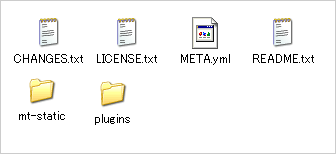 iMTのダウンロードページから落としてきたzipファイルを解凍すると中に「mt-static」「plugins」というフォルダといくつかのファイルが解凍されます。